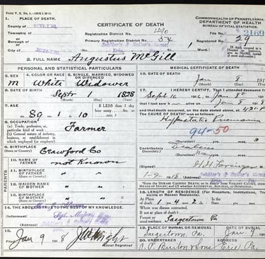 Augustus McGill was born September 1, 1828, in Crawford County, Pennsylvania, to John McGill and Isabella Ryan—faithful Methodists and determined settlers. The middle child of seven, Augustus seemed built for work. By 1840, while his older siblings were still at home, he had already taken up employment—teaching in winter months, working in the oil production industry, auditing county records, handling mail as postmaster, and still returning home to work the family farm. His hands were always busy, but his mind even more so. Raised in a family steeped in public service and Democratic politics, Augustus chose his own course—aligning instead with the Republican party. He didn’t follow blindly. He believed in liberty, and he acted on conviction, not convention.