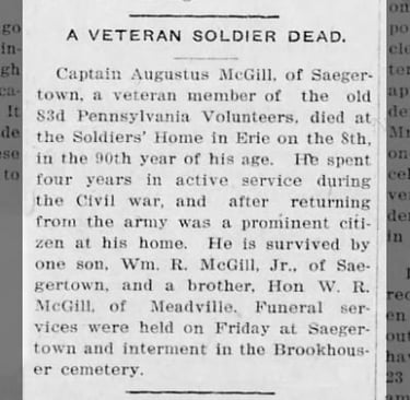 Captain Augustus McGill is buried in Brookhouser Cemetery, Hayfield Township, Pennsylvania, beneath that quiet stone. But let this stand as part of his true memorial: that he served faithfully, suffered nobly, loved deeply, and recorded a history no stone could contain.