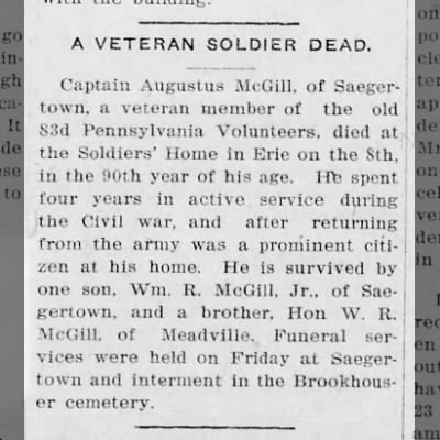 In. August, 1861, he enlisted in the Eighty third Pennsylvania Volunteer Infantry, and served, with the exception of one short interval, through the war. He took part in the siege of Yorktown and the battles of Hanover Court House, Mechanicsville, Gaines' Mills, Malvern Hill, second Bull Run, Antietam and Fredericksburg, at the last place receiving injuries which necessitated his retiring for a short time from active service. In June, 1863, Lee invaded Pennsylvania while Capt. McGill was at home an invalid. Gov. Curtin issued a call for three months' men, and in less than twenty four hours the Captain was on his way to Pittsburgh with a full company. After the repulsion of the enemy, the Captain returned to the Army of the Potomac, went through Grant's campaign in the Wilderness, was in the assault on Cold Harbor, the advance on Petersburg, the capture of the Norfolk and Weldon Railroad, etc. In the spring of 1865, he was in the last campaign against Lee, and was at Lewis' Farm, Boydton Road and Five Forks and many other fights, and was present at Lee's surrender. Since the war, the Captain has served ten years as magistrate in his native town, and successfully pursued other vocations suited to his crippled condition. His son, William R. McGill, is a young man of estimable qualities, is also a resident of this township, and is engaged in farming.