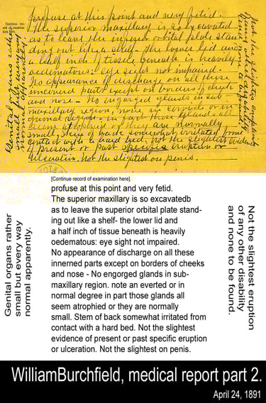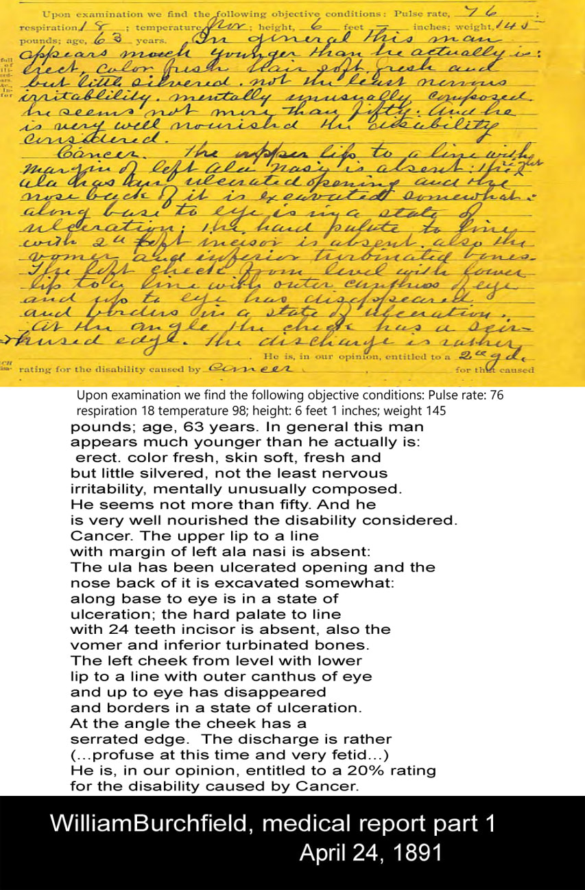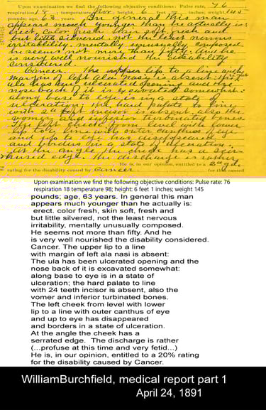Although William was suffering from Cancer, these are military veterans records, as he was trying to be approved for monetary benefits, prior to his death. This is dated April 24, 1891. William did not appear for testimony as his doctor said traveling would create a "Danger to his life, by reason of exhaustion and danger of imminent hemorrhage."