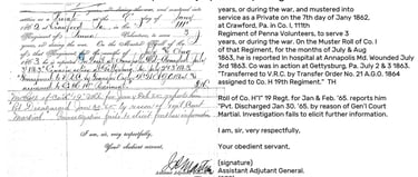 Wounded at the Battle of Gettysburg and hospitalized for 2 months in Annapolis for his injuries, but the ball was never removed. The ball in his abdomen had become dislodged In 1866 starting a local inflammation which developed general Peritonitis. After an attempt at removing the bullet, hemorrhaging, and 10 days in a coma preceded his death. Dr. E.H. Dewey of Meadville, who attended at the time of death, reported that there was no doubt his war injuries eventually led to his death.